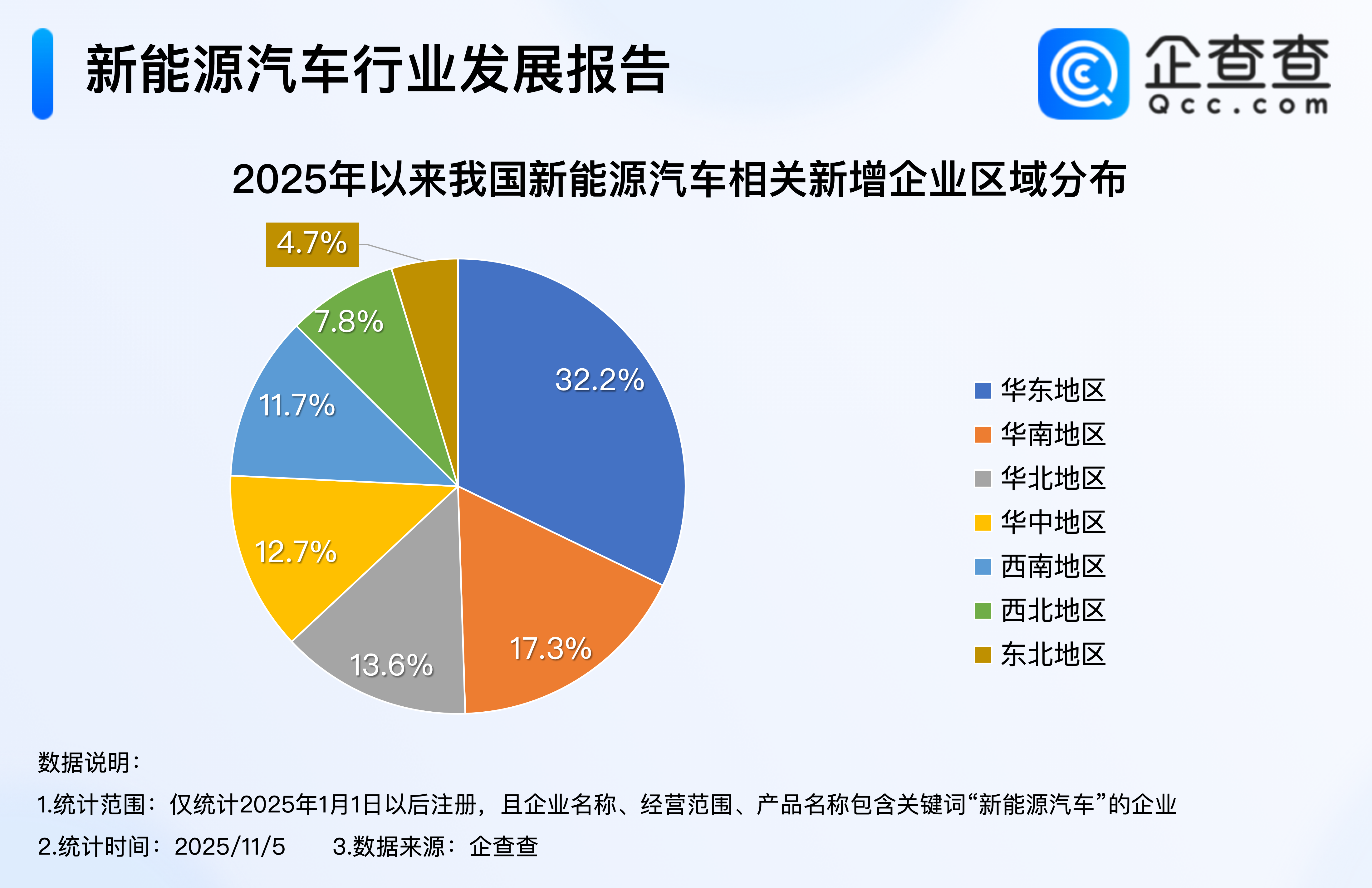 企查查数据显示,2020年至2023年,我国新能源汽车相关企业每年注册量逐年增加至32.4万家;2024年全年,我国累计注册31.5万家新能源汽车相关企业。截至11月5日,2025年我国已注册27.1万家新能源汽车相关企业,相比2024年同期增加4.1%。2.从区域分布来看:华东地区优势明显长江云配,占比32.2%